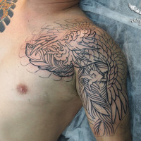 連日施術を行っています。 ファーストタトゥーのからも和のモチーフは非常に人気です。 龍、虎、鳳凰はもちろん観音など幅広くデザインします。 複数彫師が在籍しデザインのご要望に合わせた彫師をオススメしています。 5分、7分か …