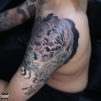 和彫り・ブラック&グレーをメインジャンルとした彫師が在籍しています!! 持ち込みデザインのアレンジを得意としています。 フルスリーブやバックピーズ等の大きな作品もお任せください!!